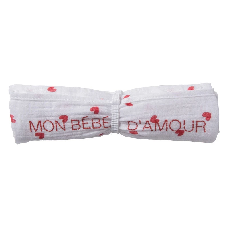 La finition de ce lange d’un blanc lumineux est vraiment soignée avec un imprimé recouvert de petits cœurs rouges et une délicate sérigraphie « Mon bébé d’amour ».