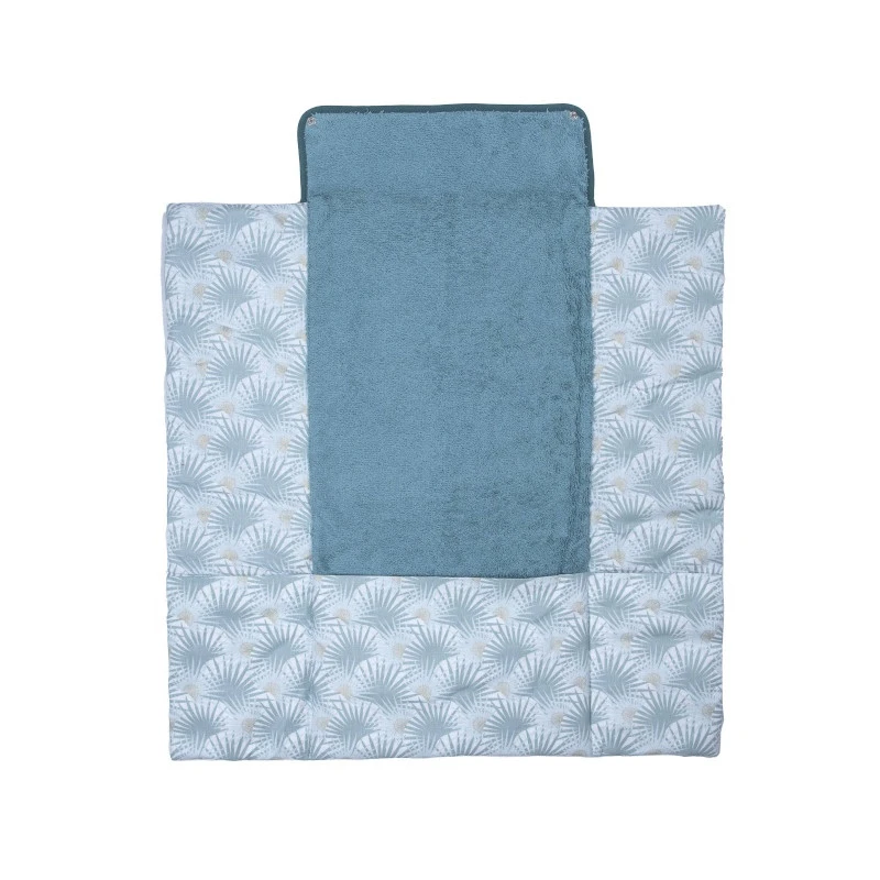 Le tapis à langer nomade BB&Co Palm Springs est composé d’une partie centrale en éponge verte céladon, où accueillir confortablement votre bébé, bordée de chaque côté d’un joli tissu imprimé de grandes feuilles de palmiers dans les mêmes tons. Ce tissu à motifs dispose de pochettes pour y transporter couches ou lingettes.