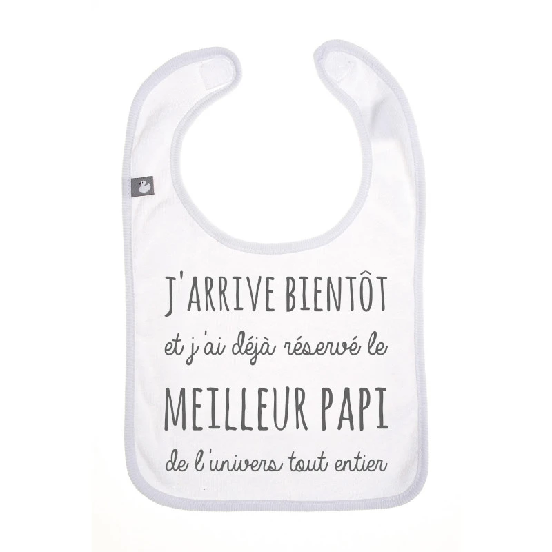 En effet, cette mystérieuse pochette-surprise de BB&Co contient… Un adorable bavoir au message explicite : « J’arrive bientôt et j’ai déjà réservé le meilleur papi de l’univers tout entier ».